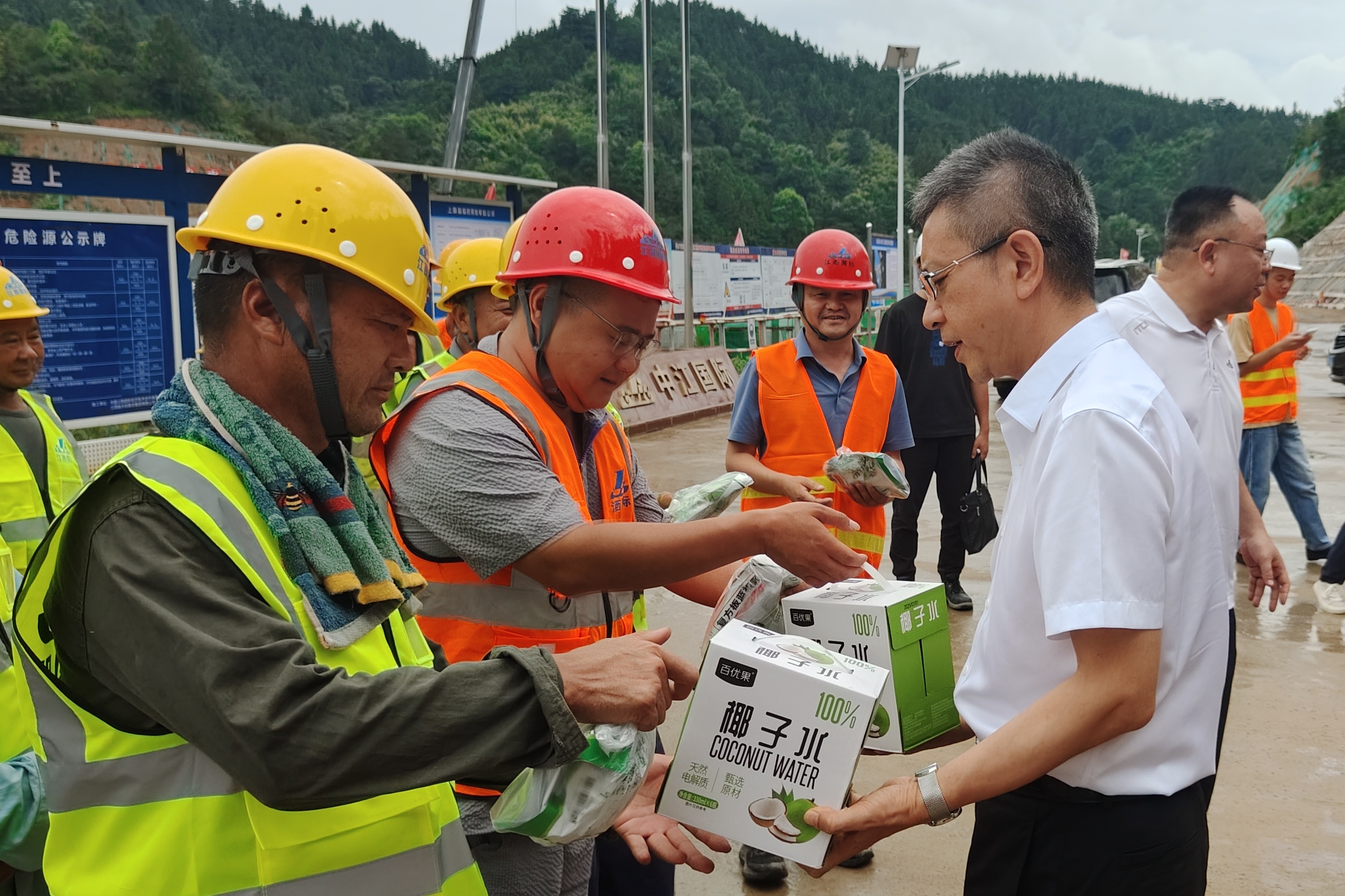 慰问中,,,,,张建安听取了项目建设进展、防暑降温措施及安全生产落实情况的汇报,,,,,亲切看望一线施工人员,,,,,亲手将椰子水、西瓜、防暑药品等物资送到大家手中,,,,,对大家顶着烈日战高温、保进度的奉献精神表示高度赞赏和衷心感谢。。。。。。。他还实地察看项目部员工办公生活区,,,,,仔细询问居住条件、饮食卫生等细节,,,,,叮嘱项目部要切实做细做实后勤保障工作,,,,,全力保障一线员工的健康安全,,,,,为项目顺利推进筑牢基础。。。。。。。