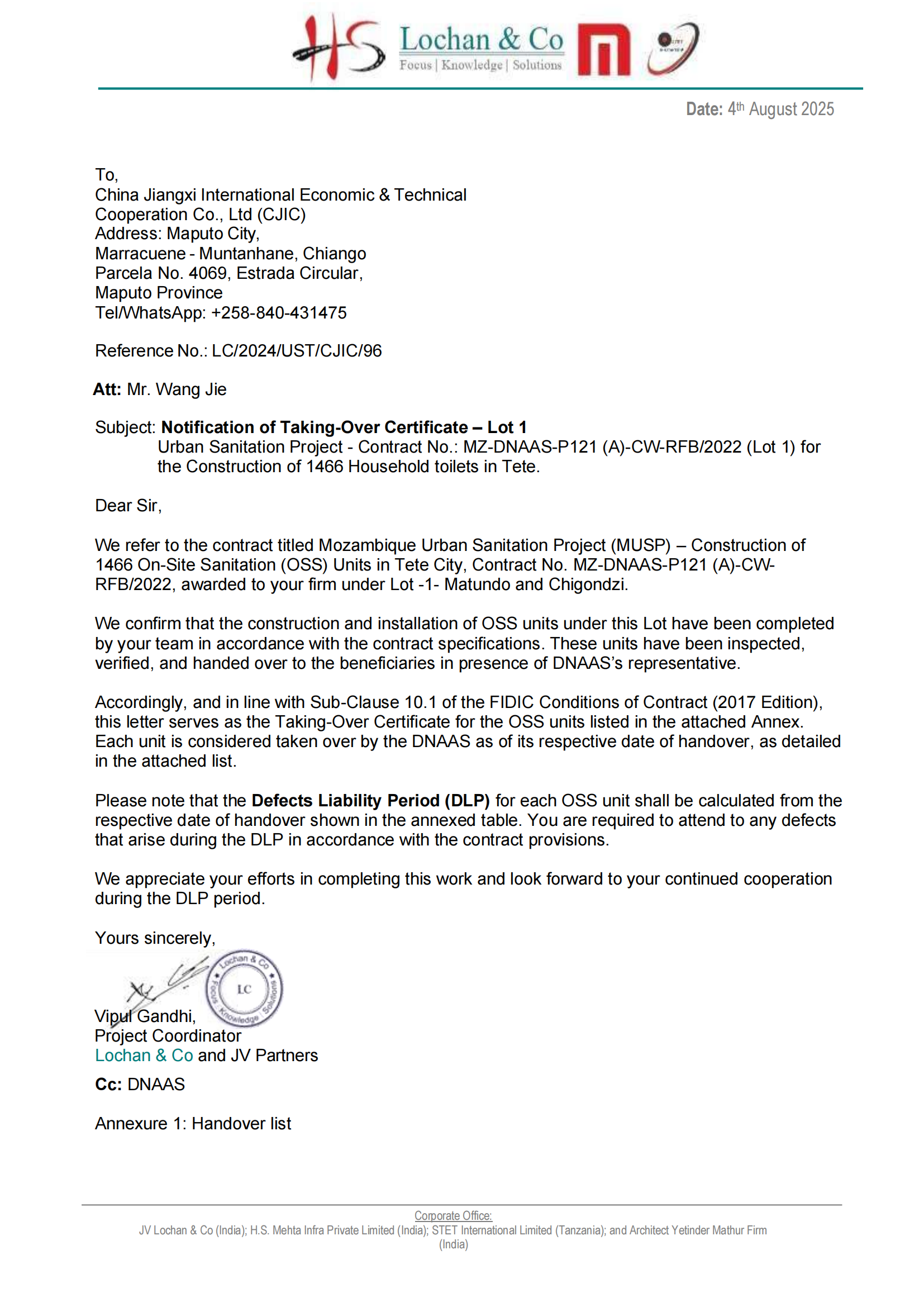 8月4日,,,,,,由公司实施的莫桑比克泰特城市卫生改造项目顺利完成2933个家用卫生间建设,,,,,,提前1个月完成全部施工任务并正式移交。。。。。。